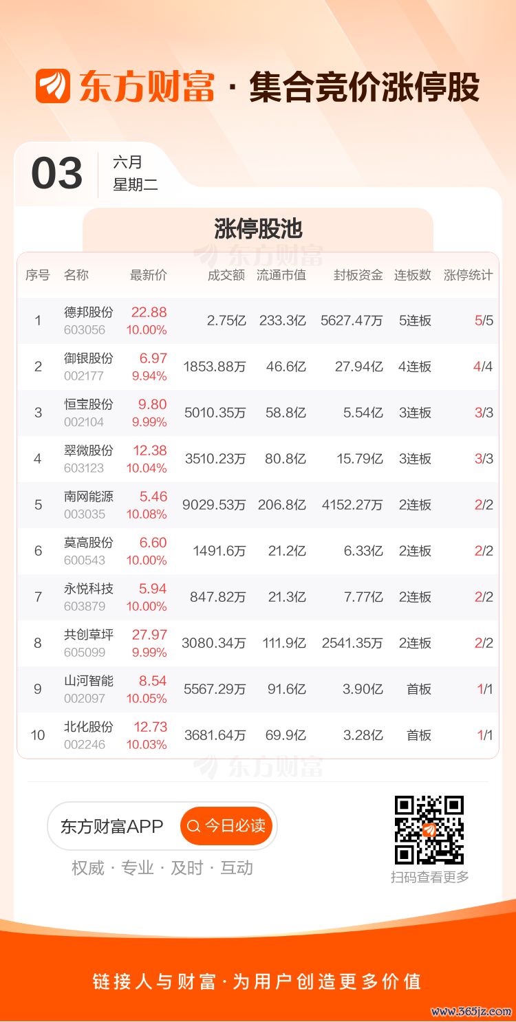 个股方面,10股竞价涨停,其中德邦股份5连板、御银股份4连板、恒宝股份3连板、翠微股份3连板、南网能源2连板。