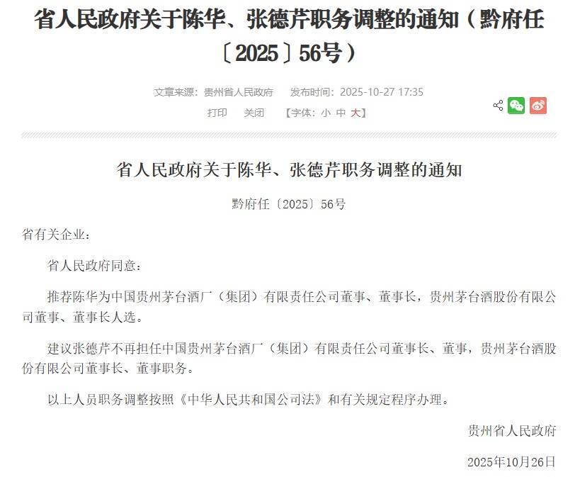 【大河财立方消息】10月27日消息长宏网,贵州省人民政府近日发布关于陈华、张德芹职务调整的通知。